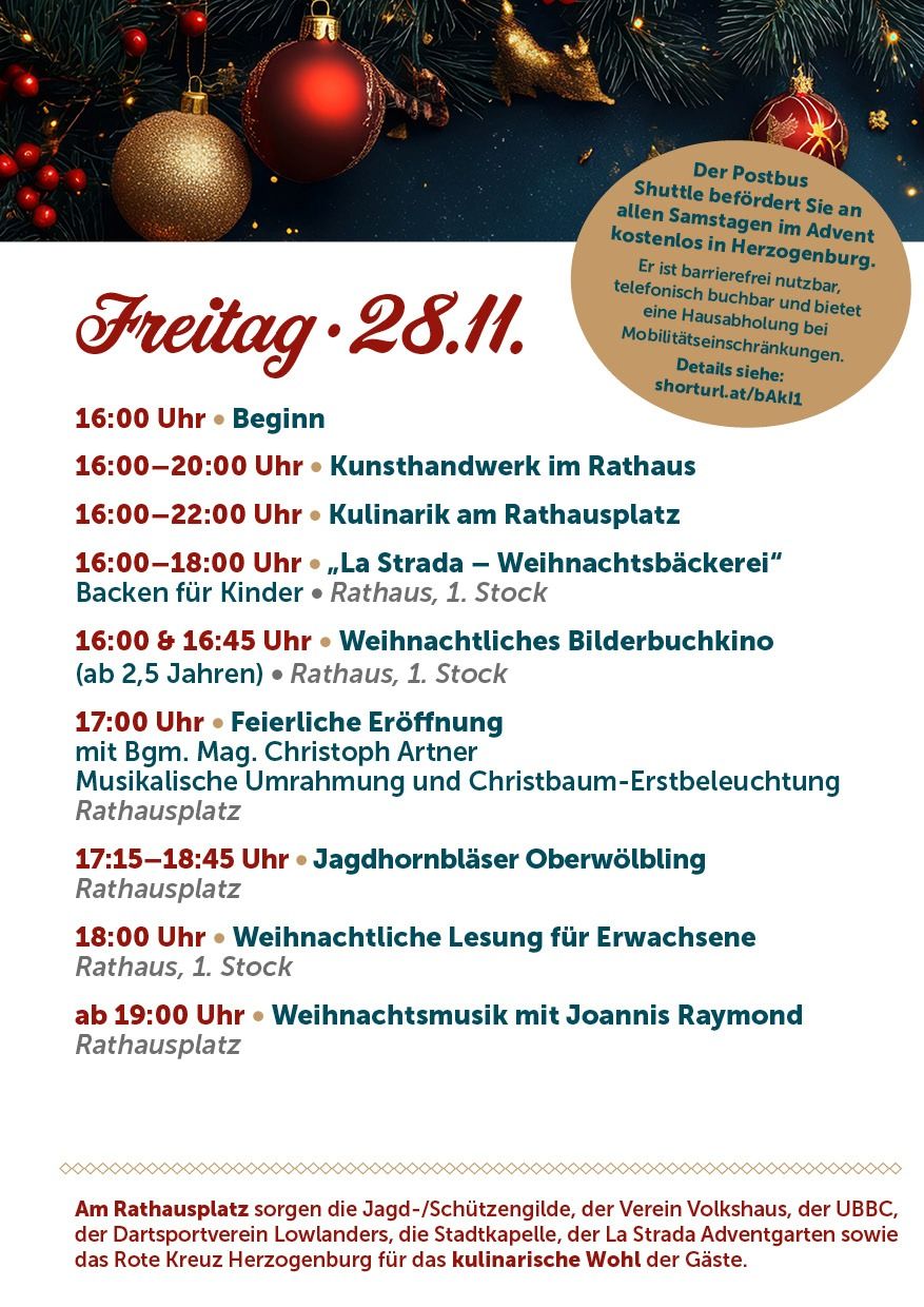 17:00 Uhr: Feierliche Eröffnung mit Bgm. Mag. Christoph Artner und musikalischer Umrahmung, Christbaum-Erstbeleuchtung - Rathausplatz