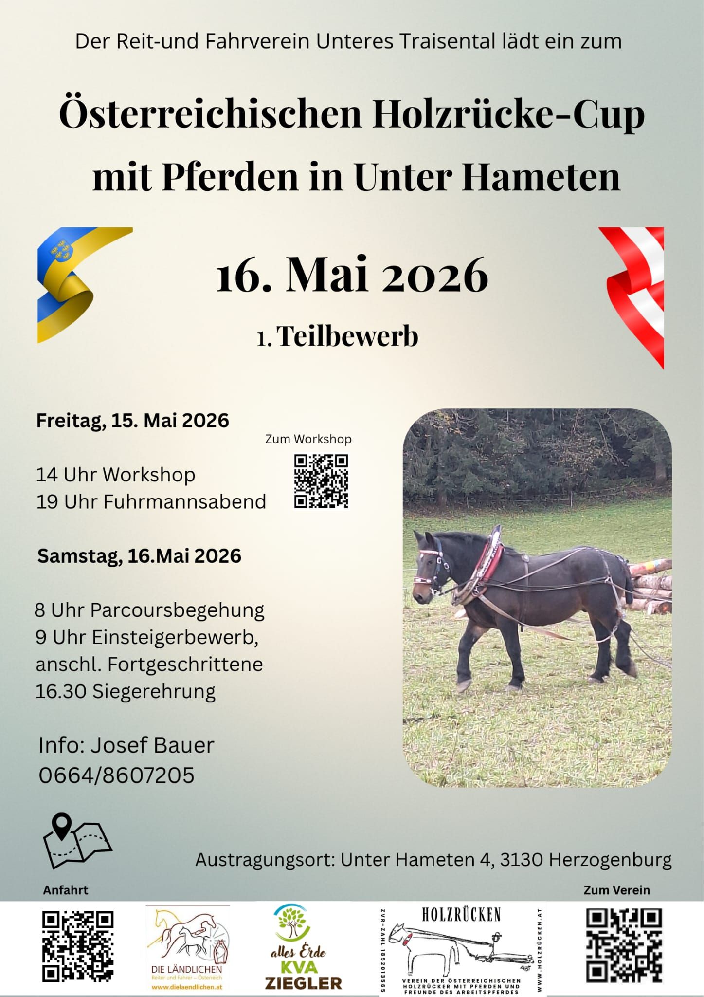 Der Reit- und Fahrverein Unteres Traisental lädt ein zum Österreichischen Holzrücke-Cup mit Pferden in Unter Hameten.