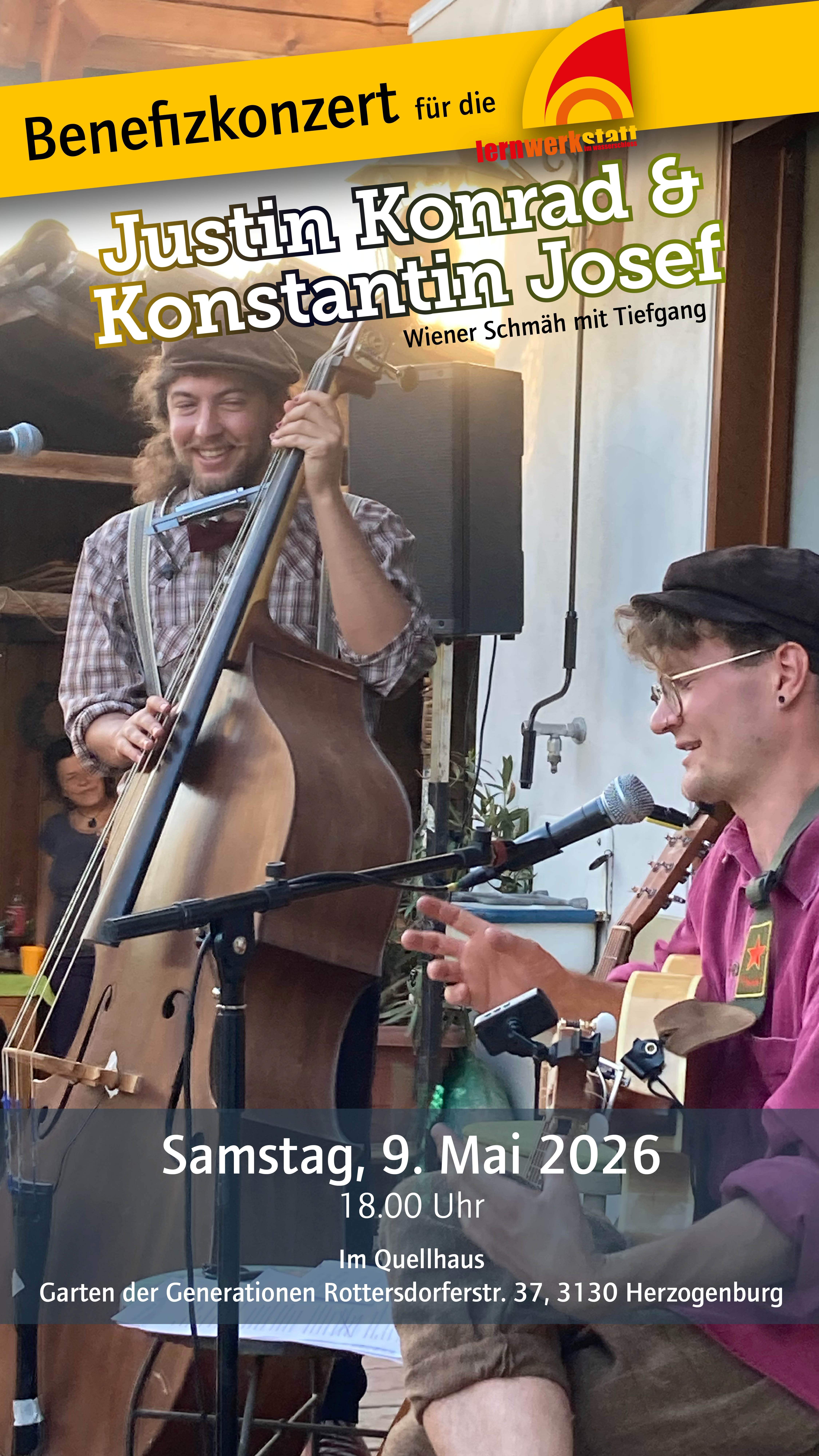 Ein neu erfundenes Duo das sich durch die Gassen von Herzogenburg drängelnd den Weltruhm erspielen will. Pseudopeotische Texte treffen auf schräge Austropop Harmonien, abgerundet mit ein bissl Wiener Schmäh ergibt sich der typisch moderne-Retro-Sound der beiden Musiker.